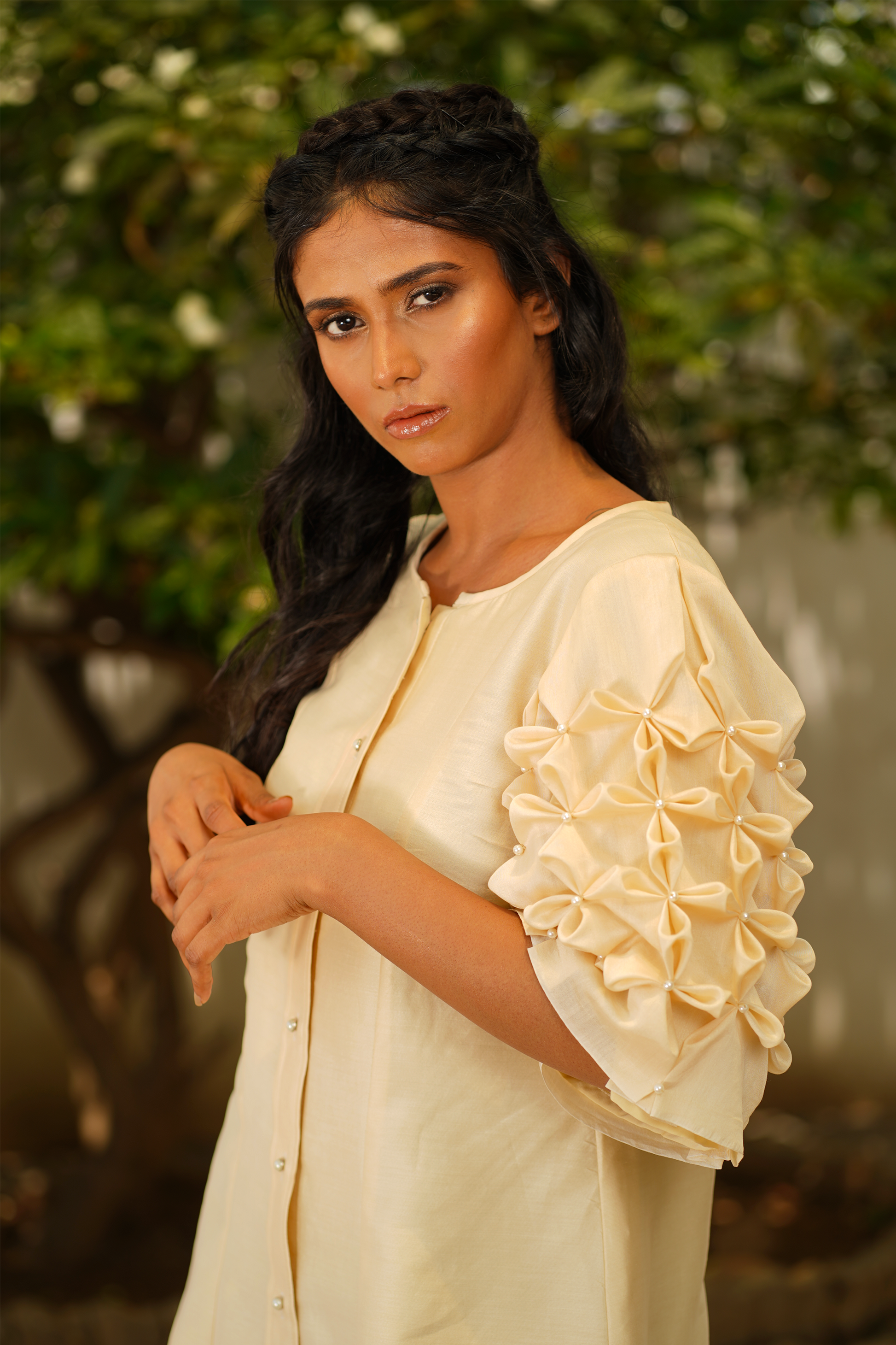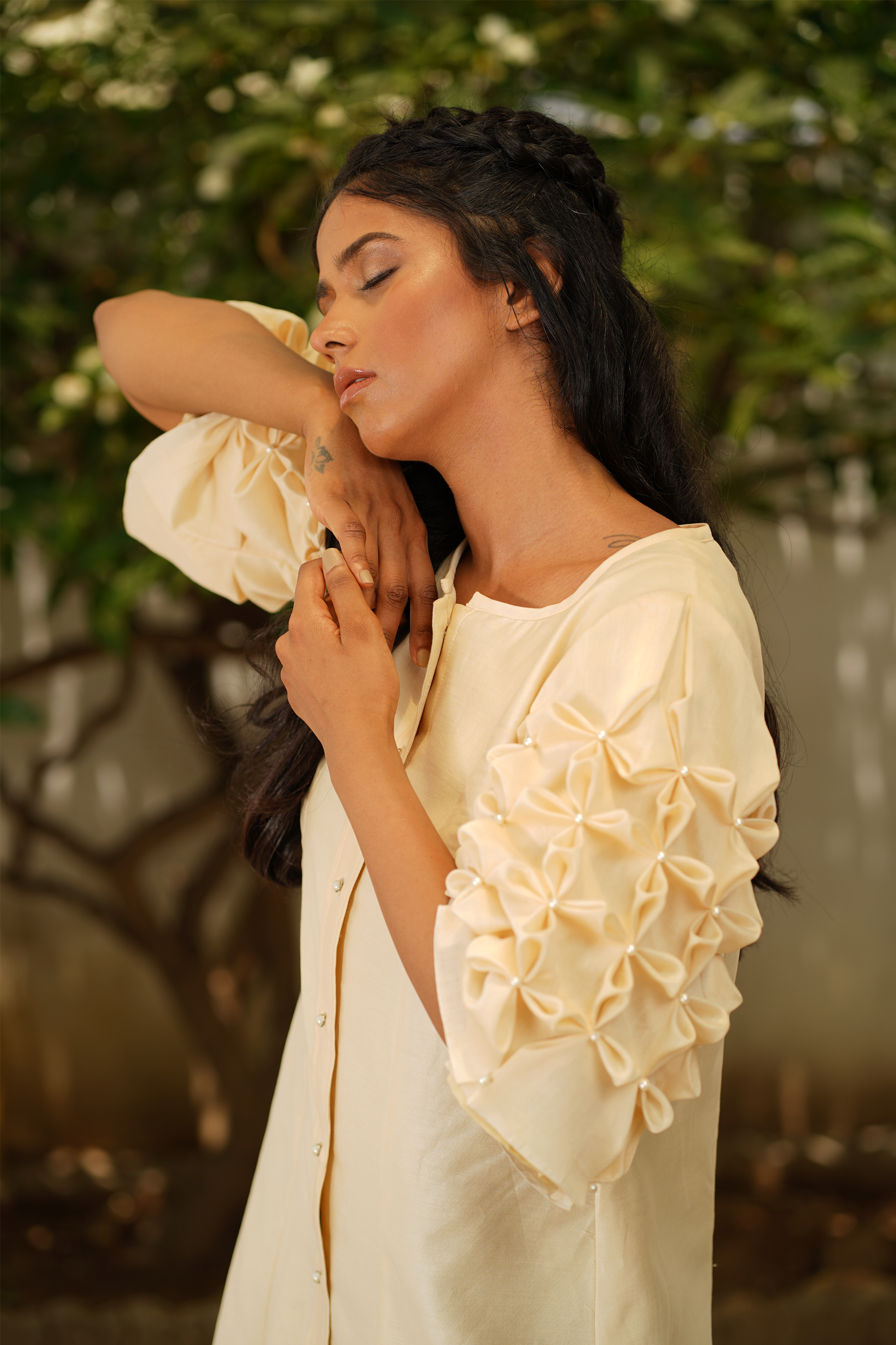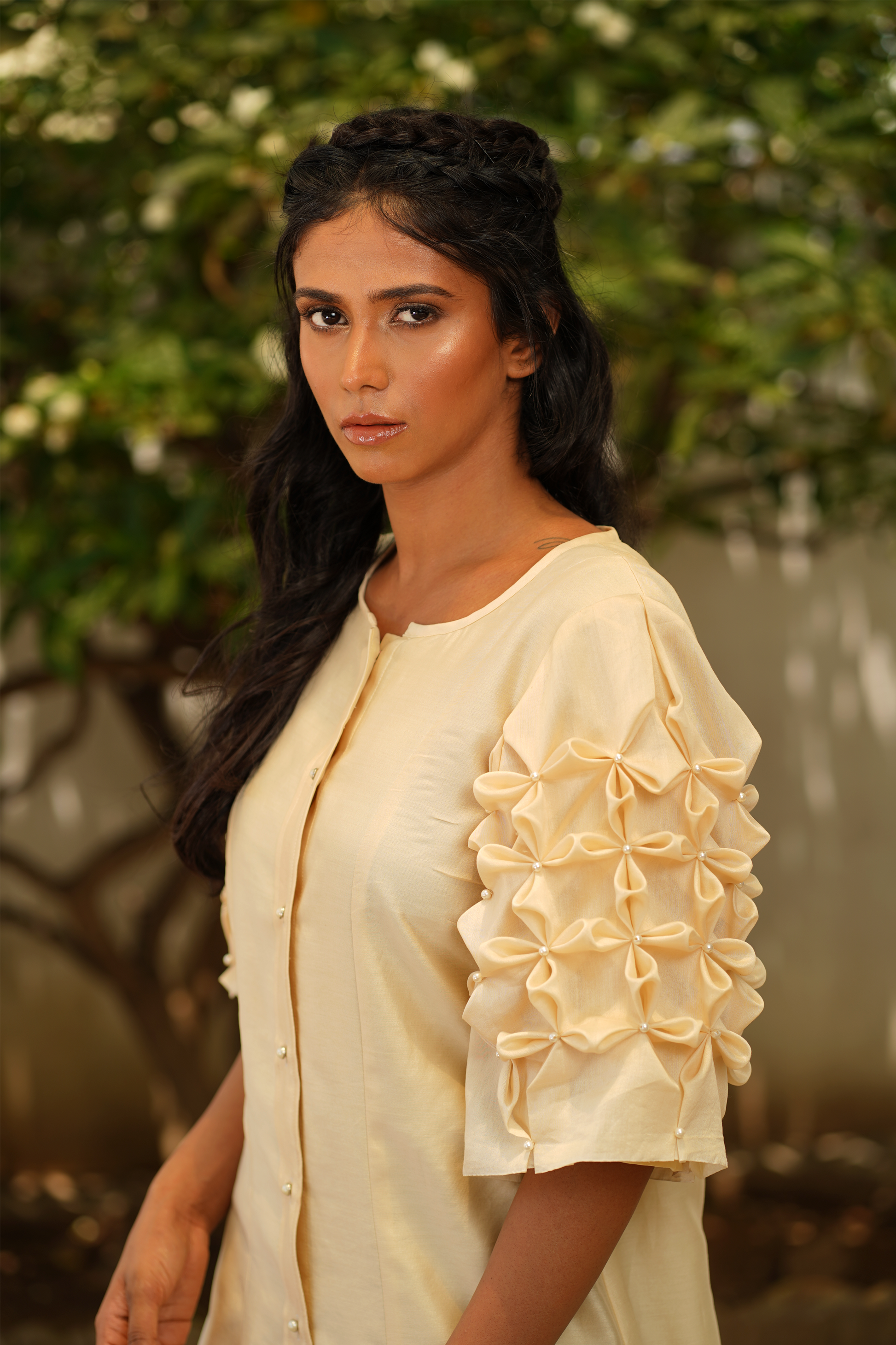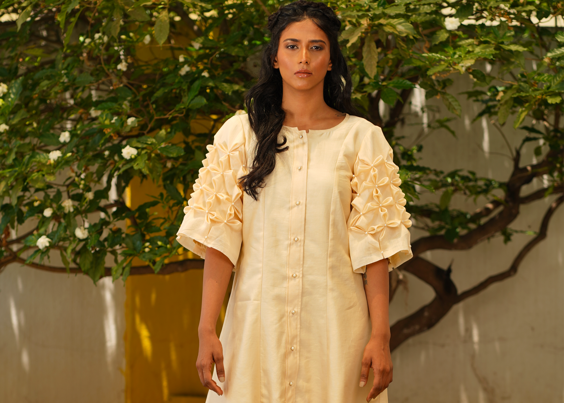 Chanderi silk dress in rich ivory with textured florets in sleeve, pearl buttons for accent.