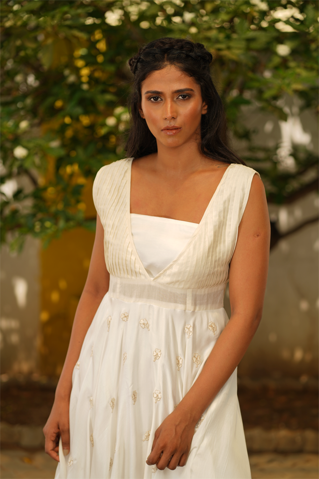 A whimsical feeling when you wear the modal satin white midi dress. The circle skirt has subtle embroidery and pairs with a pin-tucked bodice with a yoke.