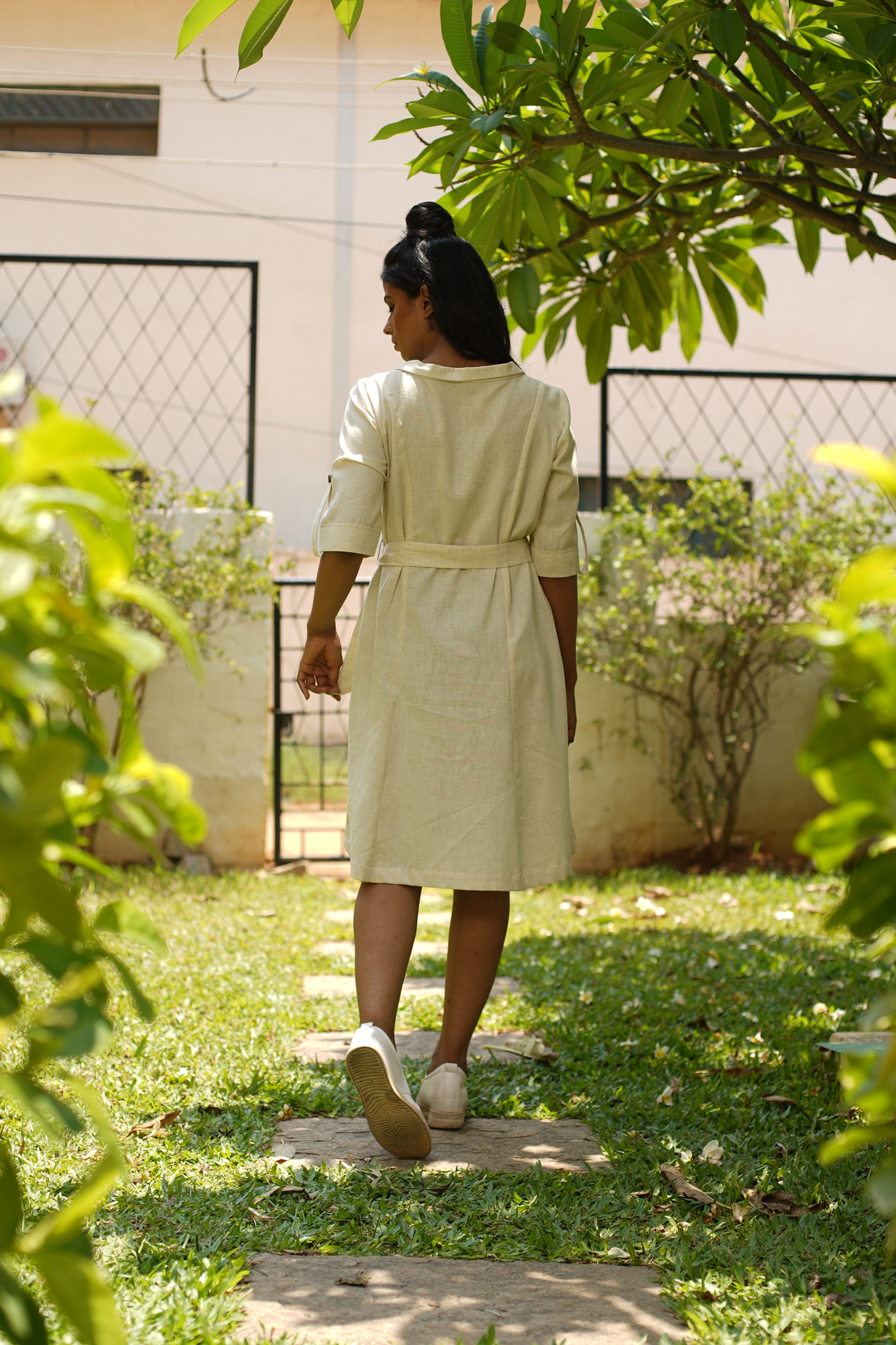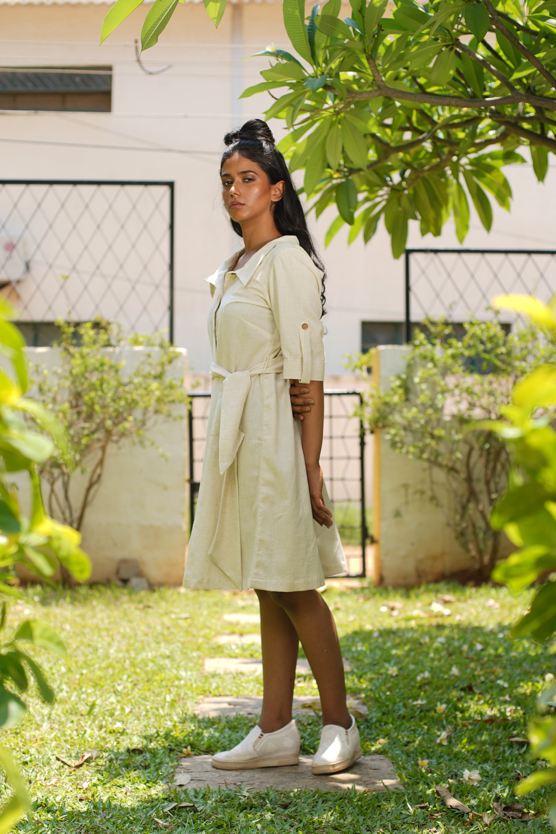 Paneled button down shirt dress in soft cotton. Button detailing at sleeve and placket with sash to cinch the waist as a tie up.