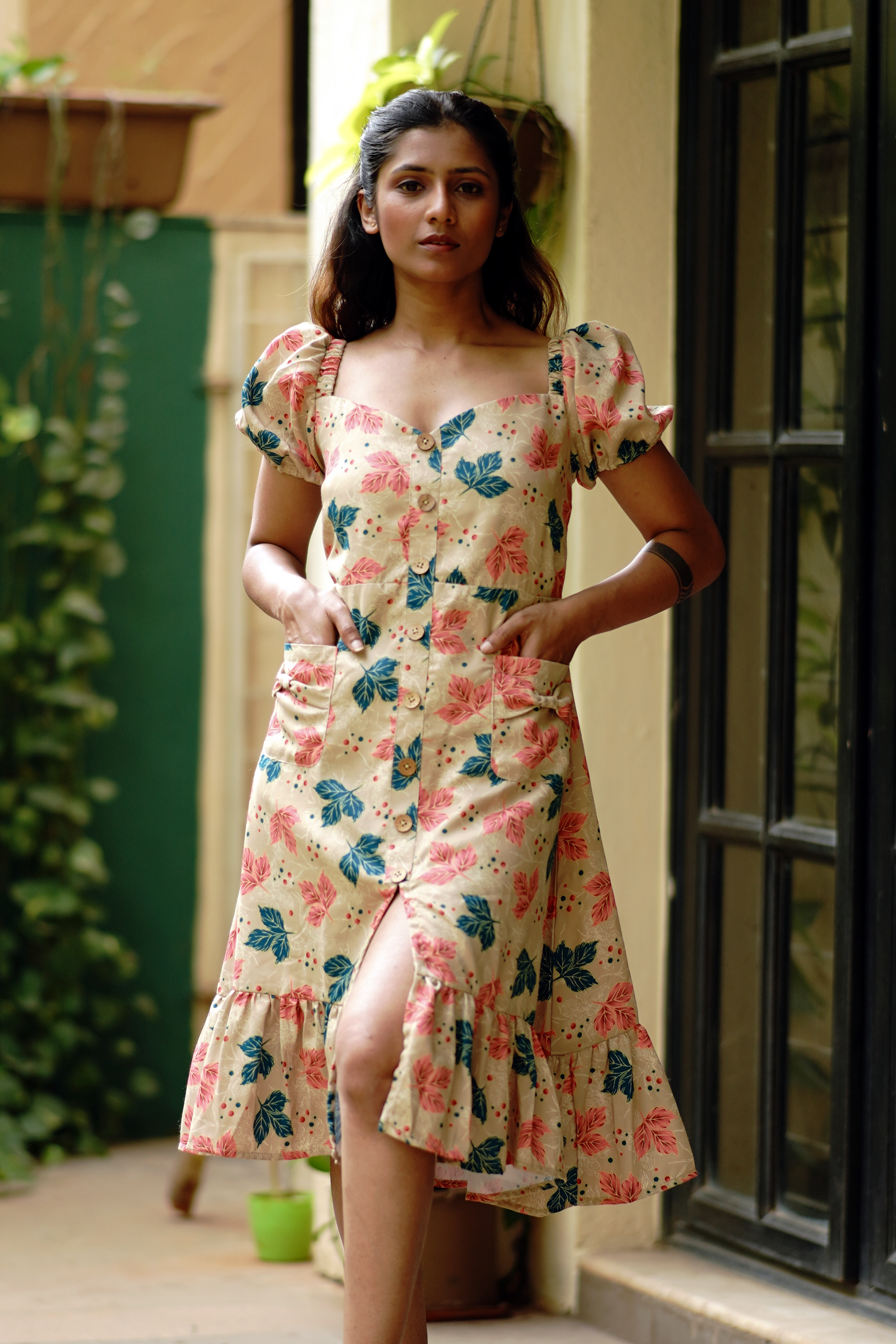 Digitally printed beige and pink leaf dress in muted undertone. The A line cut, gathered short sleeve and ruffled hem lends a casual look, perfect for brunch or coffee dates.
