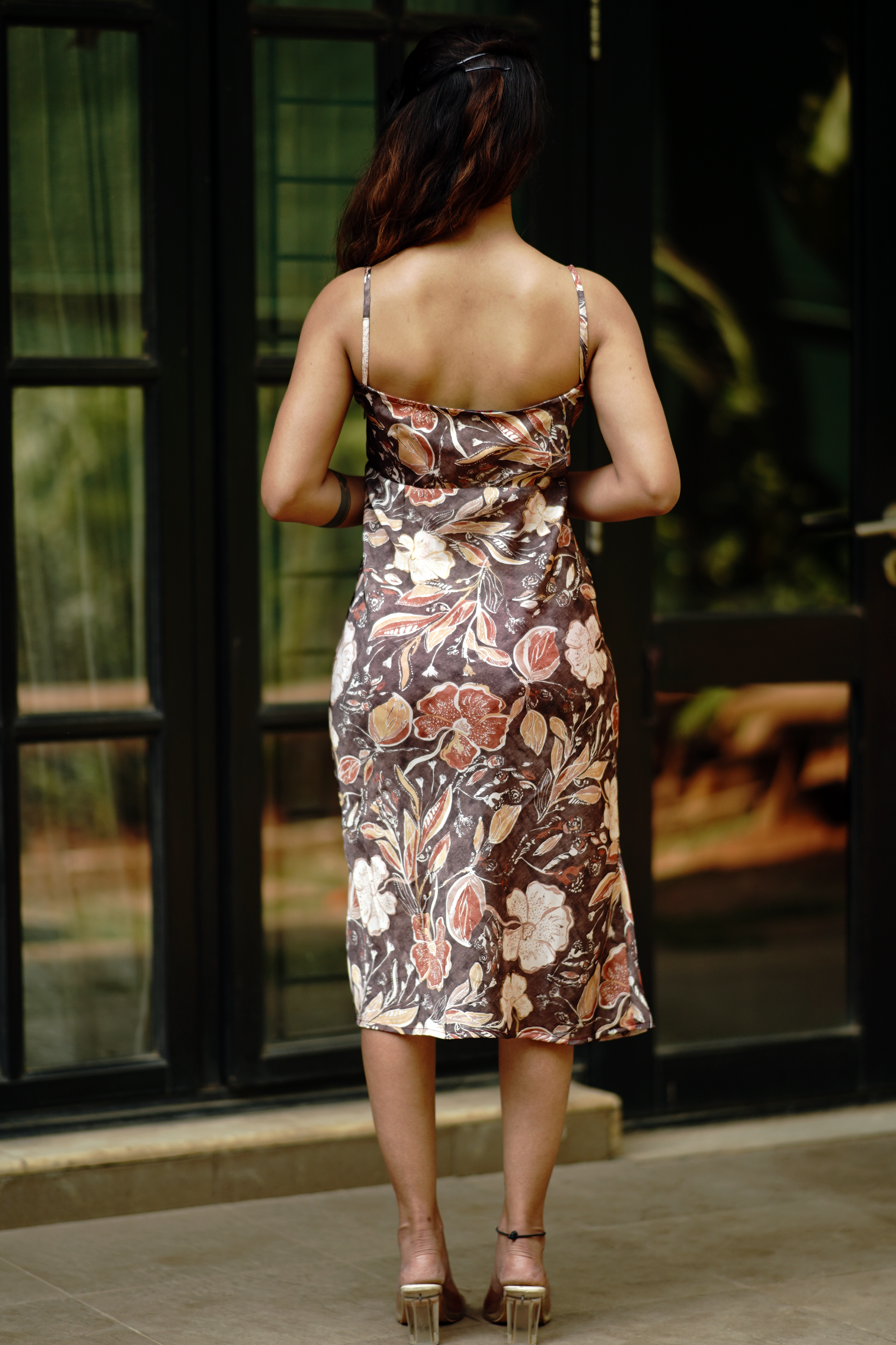 A digitally printed cowl neck dress with ruched front. Asymmetric hemline and noodle sleeves will have you dancing on your evening out in style.
