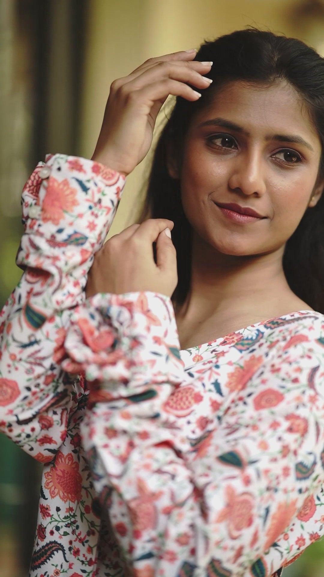A digitally printed shift dress with paisley motifs. Full sleeves with a rosette for accent in cuff.