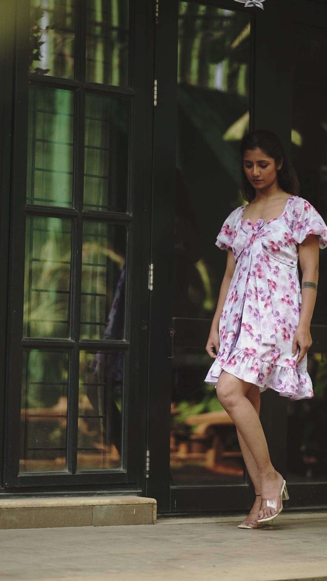 A digitally printed floral dress with a bow tie up detail in the front, and an elasticated bell sleeve for accent. Fit and flare design with a sweetheart neckline and ruffled hemline.