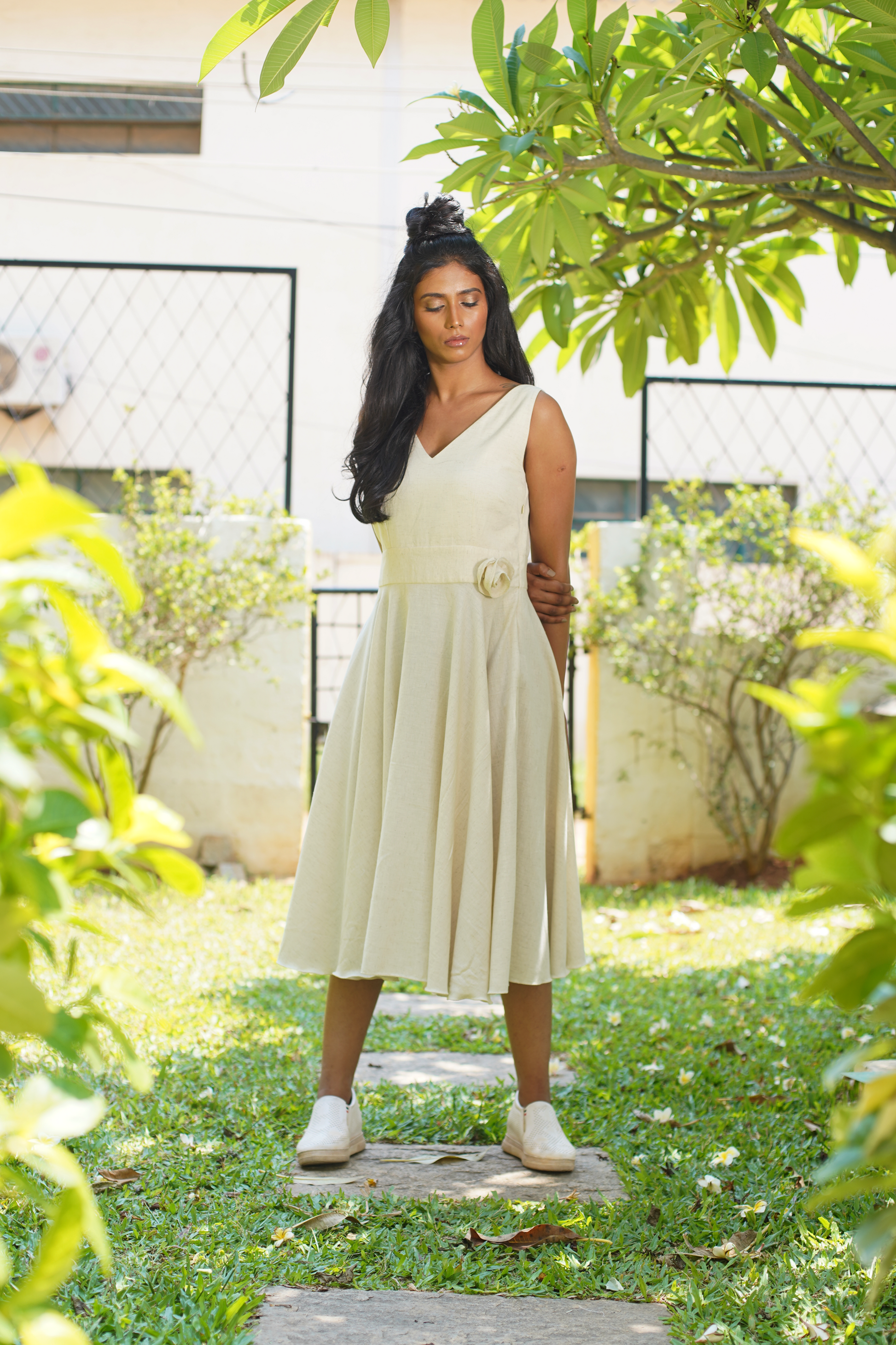 Bring the flounce to the fore in our fit and flare soft cotton dress in shell white. With a 3D rosette cinched at the waist, this dress is bound to have you breezing through your day in comfort.
